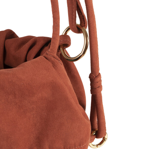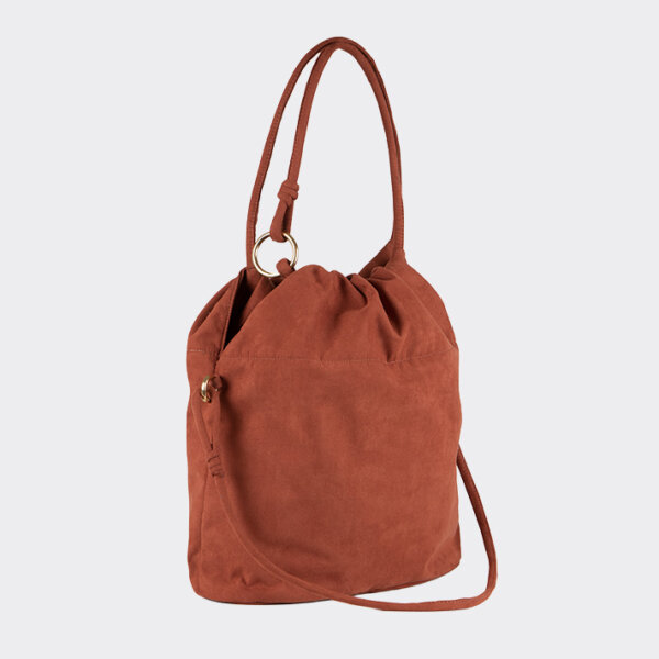 Produzida em Suede 100% poliéster, a Maya apresenta toque macio e acabamento refinado, enquanto o forro em Tricoline 100% algodão na cor terracota garante resistência e facilita a organização interna. Além disso, as alças em suede permitem o uso a tiracolo ou de mão, oferecendo versatilidade e conforto ao carregar.