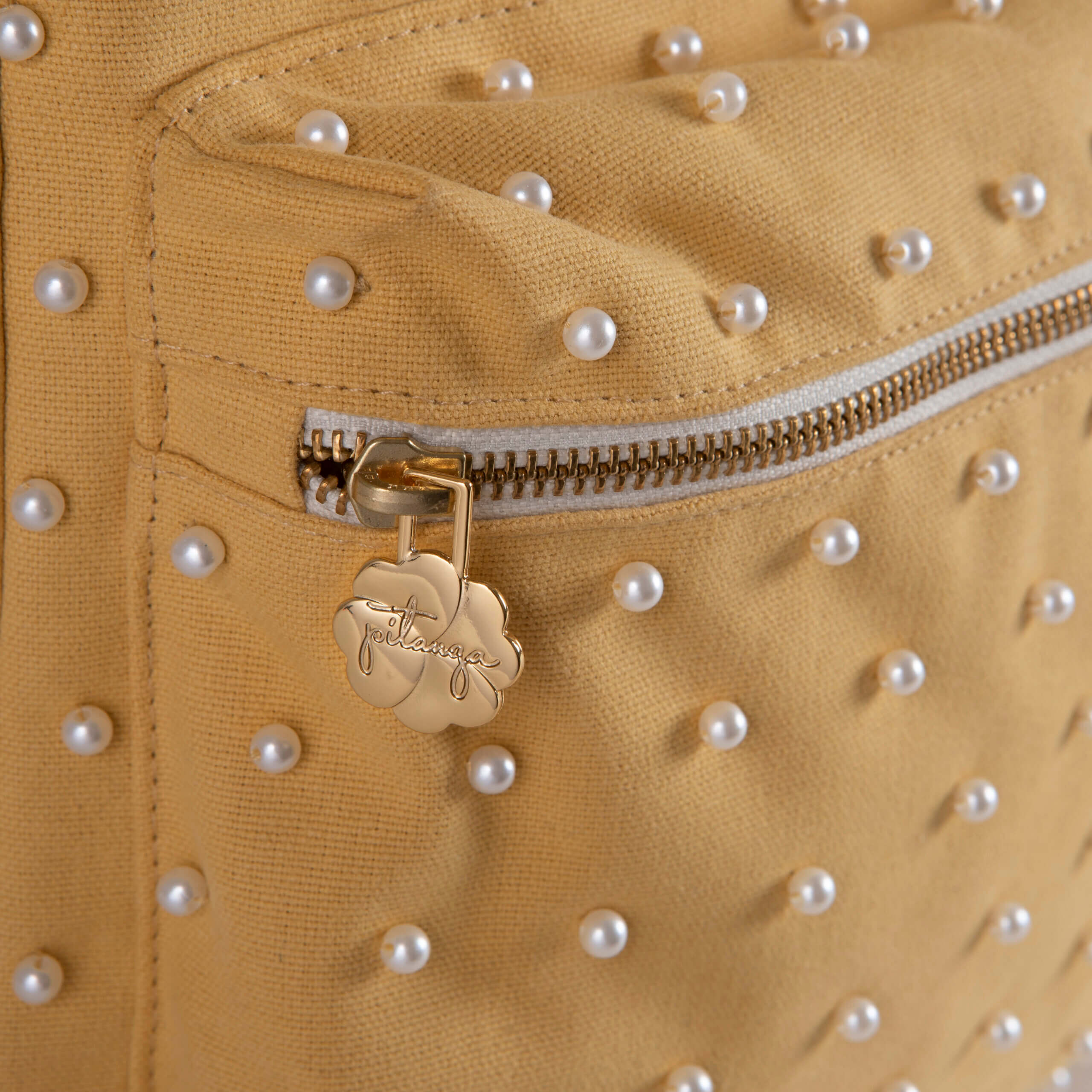 O forro em lonita crua 100% poliéster garante firmeza e resistência, sem perder a leveza. Cada pérola é costurada à mão, uma a uma, revelando o cuidado artesanal e a paciência de quem cria com propósito. O puxador personalizado Pitanga adiciona exclusividade e reforça o DNA da marca, que valoriza o olhar atento aos detalhes.