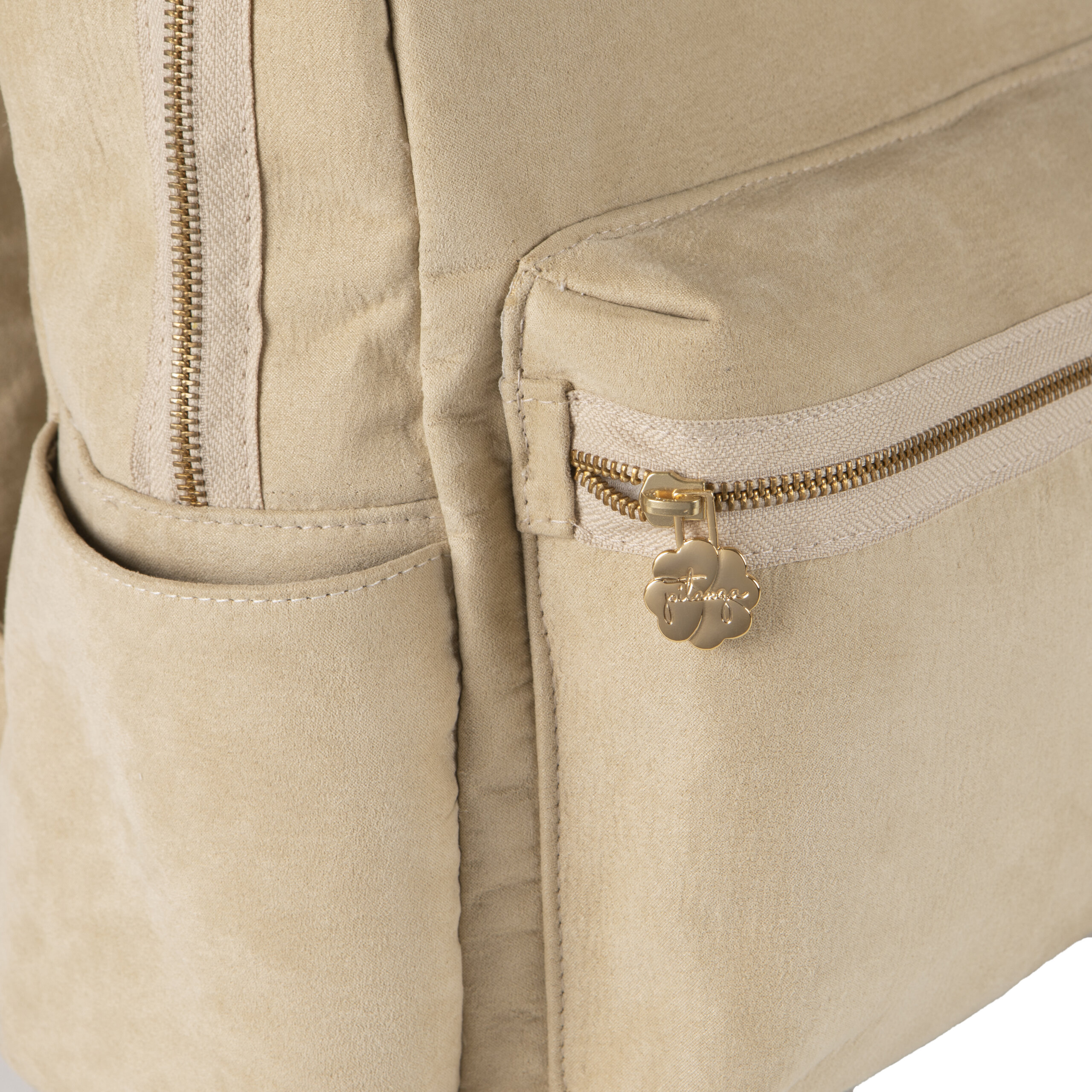 Produzida em Suede 100% poliéster, a mochila apresenta toque macio e acabamento refinado. Além disso, o forro em lonita 100% poliéster oferece resistência e durabilidade, tornando cada uso mais seguro. O zíper em metal dourado facilita o fechamento com estilo, enquanto os cadarços 100% algodão completam o visual com delicadeza e firmeza.